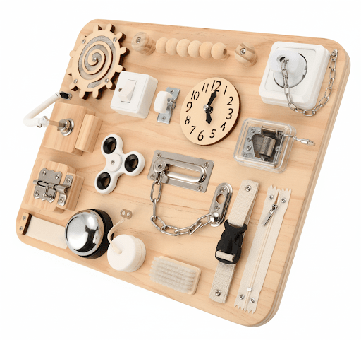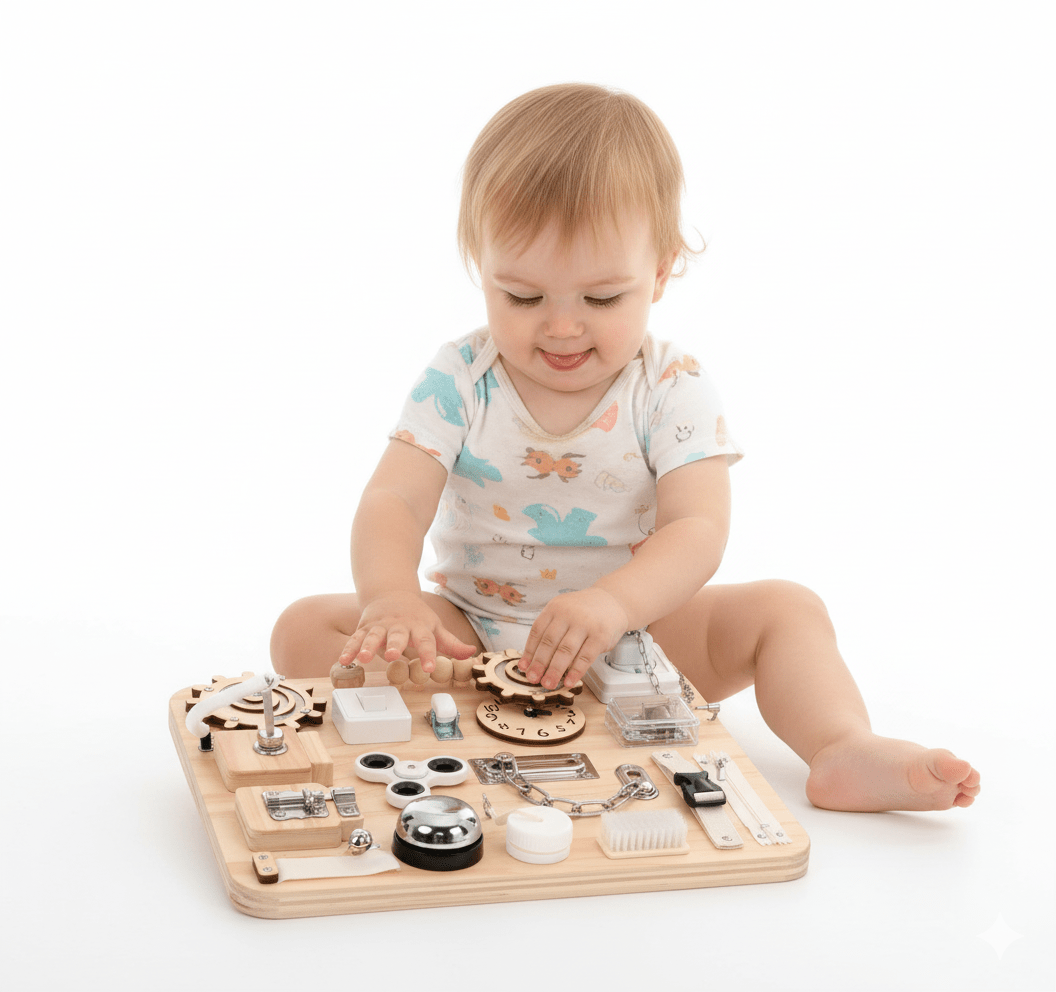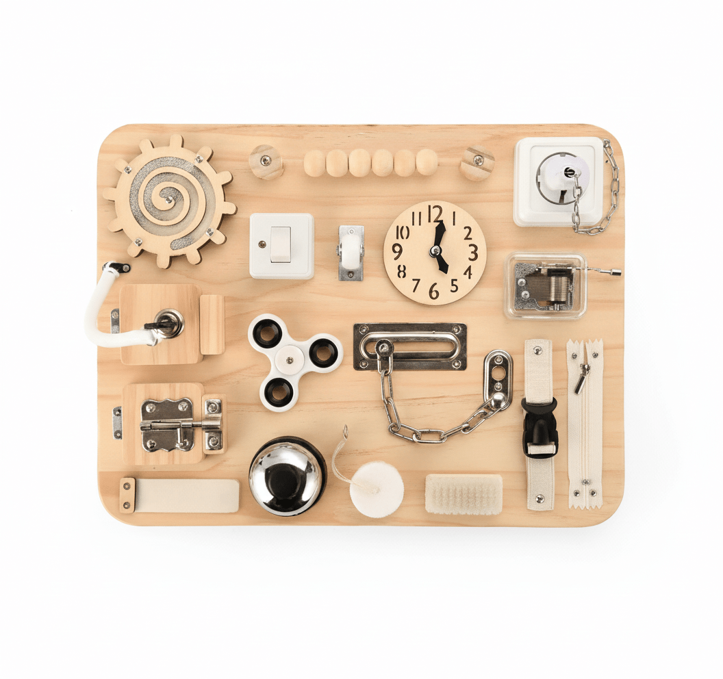 Une planche d’activité 18 en 1 qui invite votre enfant à toucher, manipuler et découvrir. Il apprend en jouant : coordination œil-main, motricité fine, concentration, autonomie… Tout cela, sans écran et sans cris d’ennui.